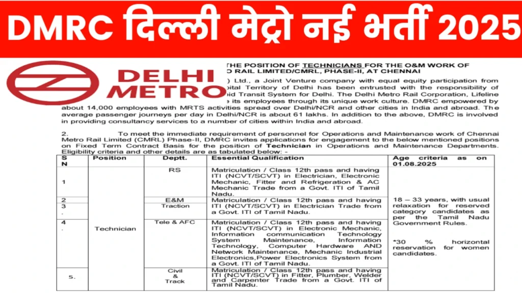DMRC Recruitment 2025: Delhi Metro Rail Corporation (DMRC) has officially announced the DMRC Recruitment 2025 for various Supervisor and Technician posts. This is a great opportunity for aspirants looking to build a career in the Indian metro rail sector, particularly in Tamil Nadu regions such as Chennai, Coimbatore, and Madurai. The recruitment process will be conducted through walk-in interviews, allowing eligible candidates to secure a position without an online test or written examination.
